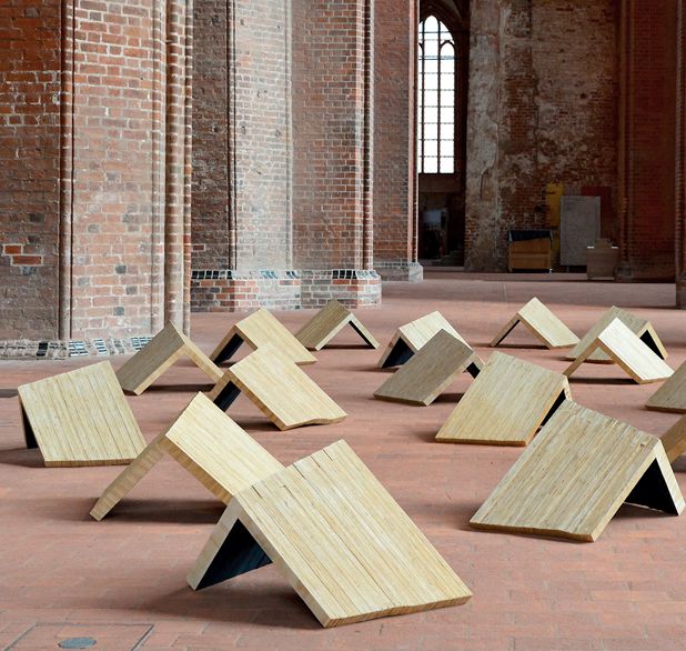 HOHE KANTE II, 2019-2020, Holz, Farbe, zwölfteilig, 256 x 128 x 128 cm